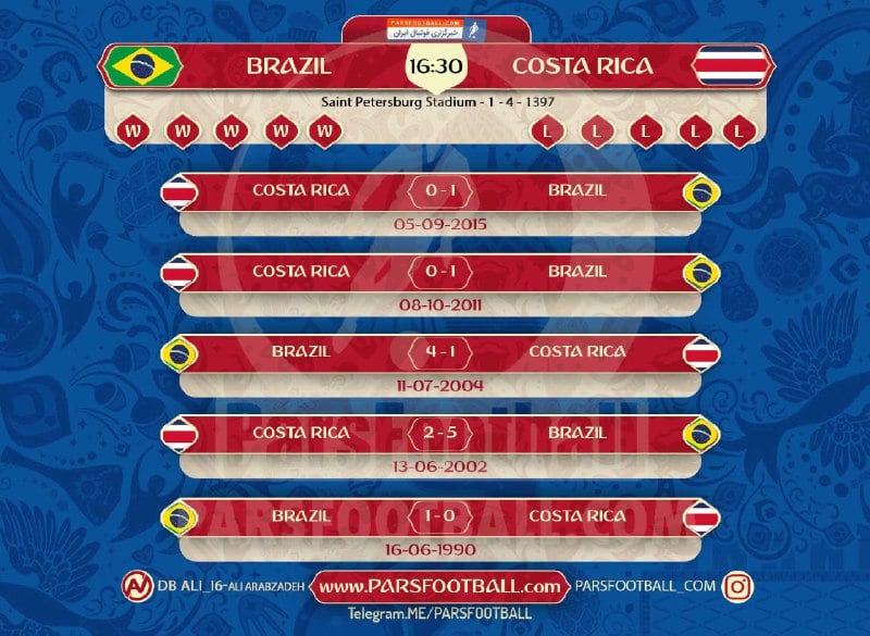 اینفوگرافی پیش بازی تیم های برزیل و کاستاریکا در بازی های جام جهانی 2018 روسیه