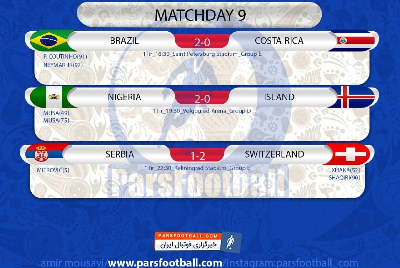 پس از پایان بازی های روز نهم جام جهانی ۲۰۱۸ روسیه ۱ تیر ۹۷، نتایج زیر بدست آمد: