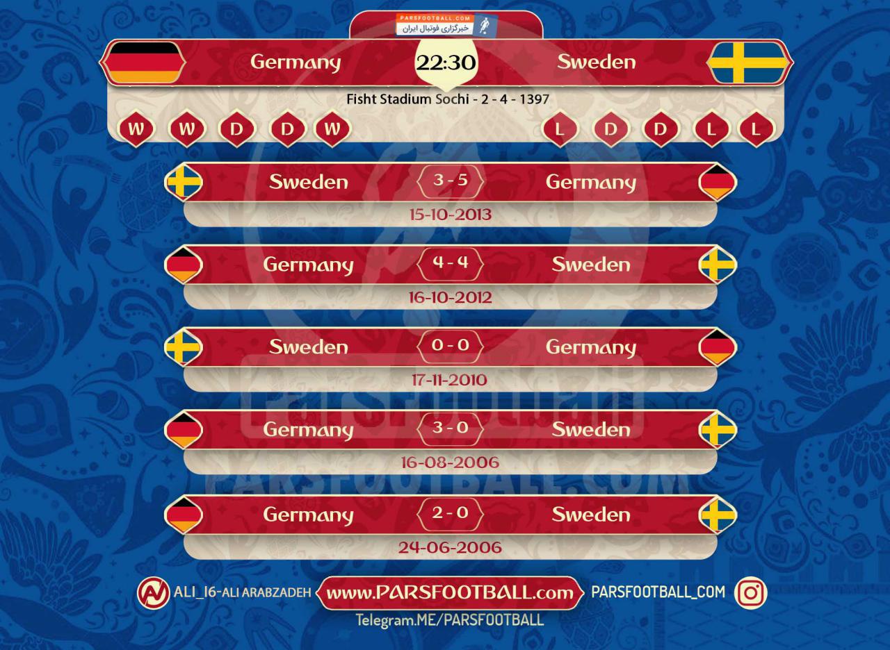 در ۶ تقابل اخیر دو تیم، ۴ پیروزی برای آلمان و ۲ تساوی به دست آمده است و باید دید سوئد بلاخره میتواند این طلسم را بشکند یا نه.