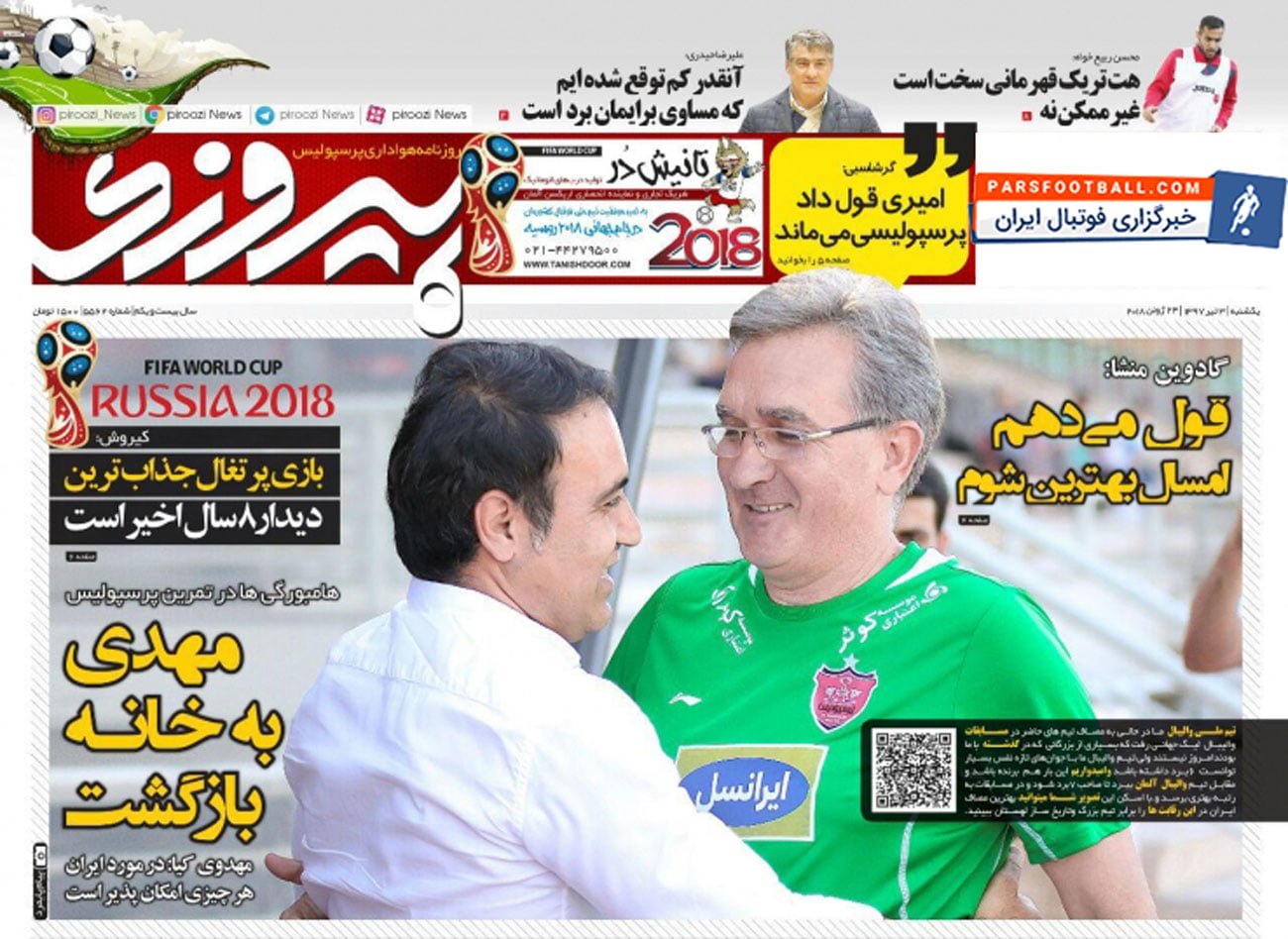 روزنامه پیروزی ، یکشنبه ۳ تیر ؛ امیری قول داد پرسپولیسی می ماند !
