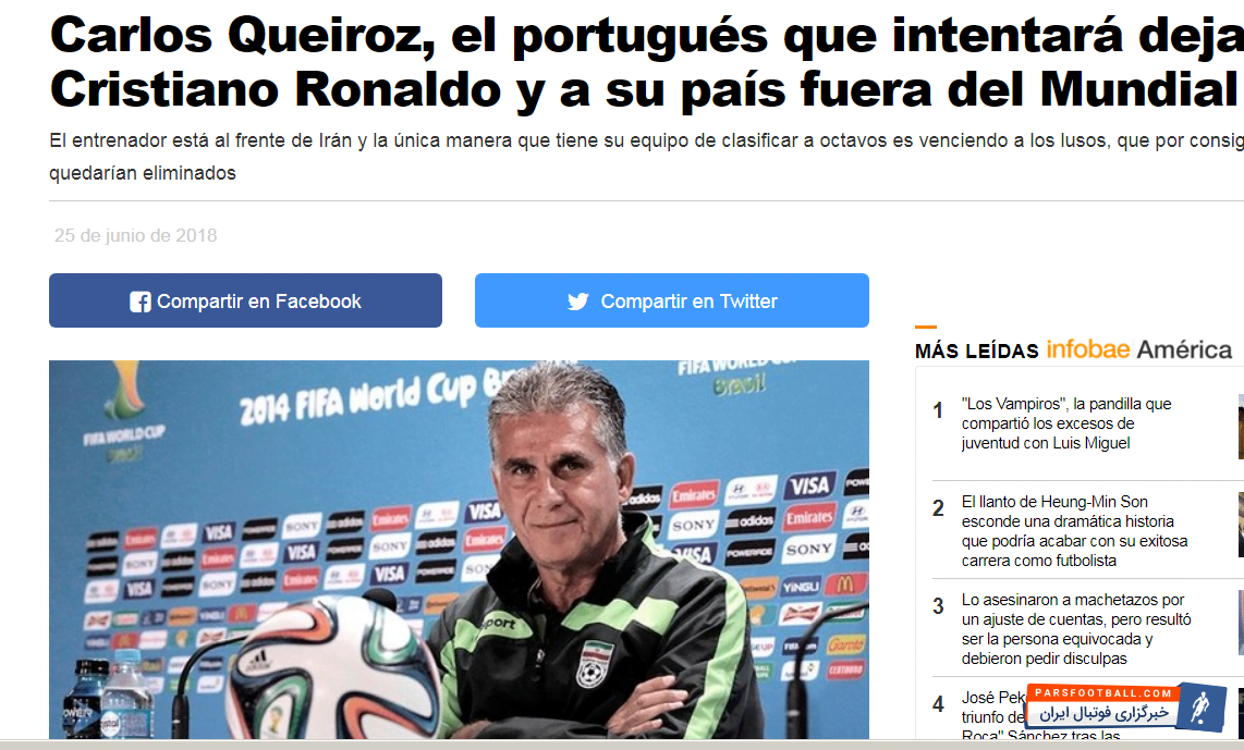 سایت «infobae» نیز به صحبت های سرمربی تیم ملی درباره رونالدو و رویارویی با تیم ملی کشور پرداخته است و تیتر خبرش را به این موضوع اختصاص داد و نوشته است: کارلوس کی روش پرتغالی تلاش می کند تا کریستیانو رونالدو و کشورش را از جام جهانی ۲۰۱۸ روسیه حذف کند.