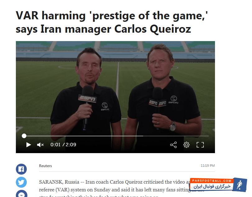سایت «espn» نیز انتقادهای سرمربی تیم ملی را درباره این تکنولوژی بازتاب داد و تیترش را این طور زد: سرمربی ایران می گوید که VAR به ماهیت فوتبال آسیب می زند.