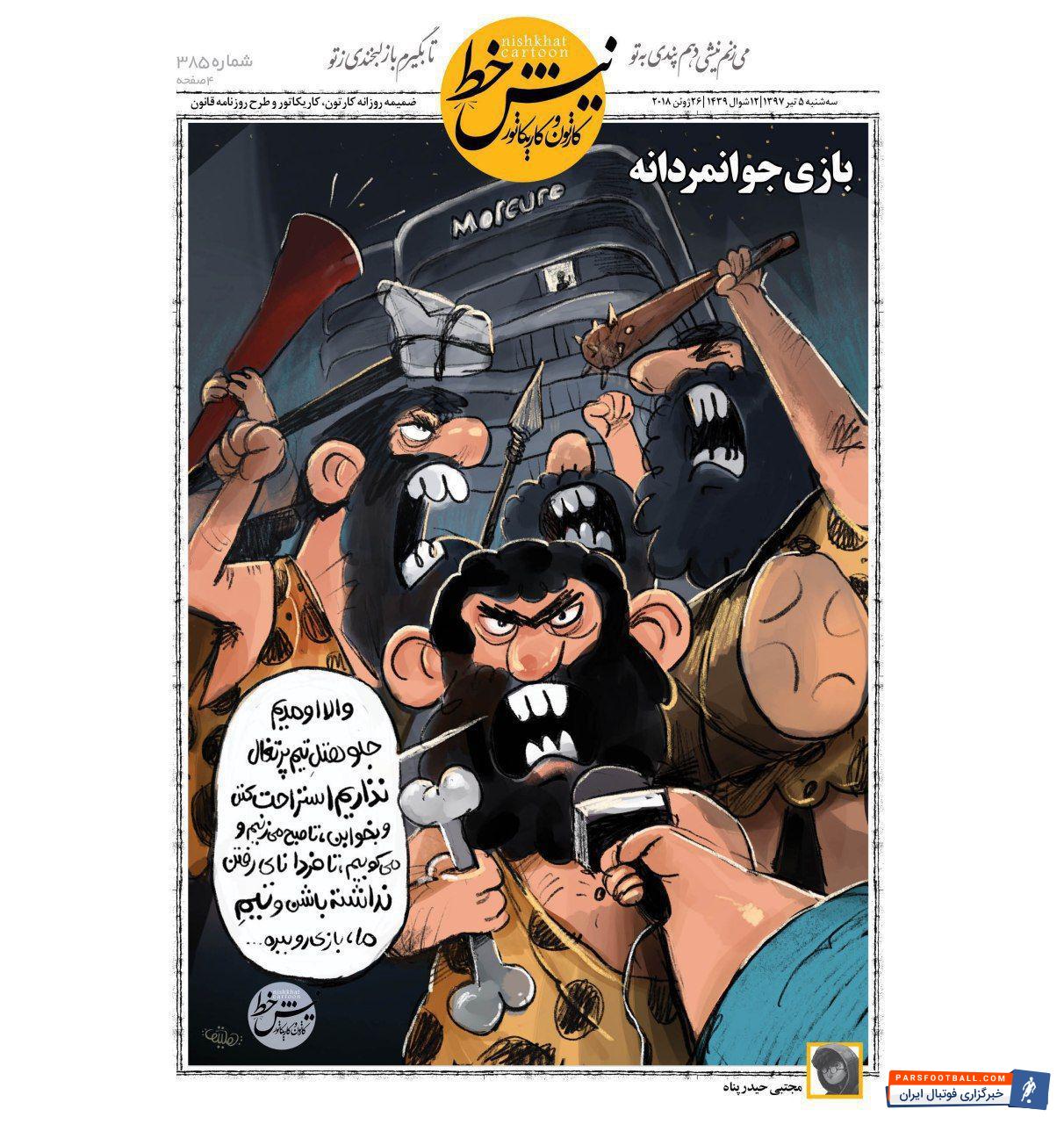 در حاشیه حضور جنجالی برخی هواداران تیم ملی فوتبال ایران مقابل هتل محل اقامت تیم ملی فوتبال پرتغال در روسیه، مجتبی حیدرپناه این کارتون را با عنوان «بازی جوانمردانه» در نیش خط منتشرکرد.