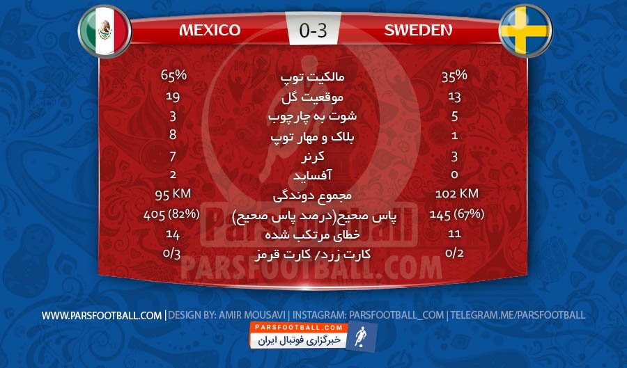 پس از پایان بازی تیم های مکزیک و سوئد در بازی های گروه F جام جهانی 2018 روسیه ۶ تیر ۹۷ که این بازی با برتری ۳-۰ سوئد به پایان رسید، در یک اینفوگرافی به آمار پایان این دیدار پرداخته ایم: