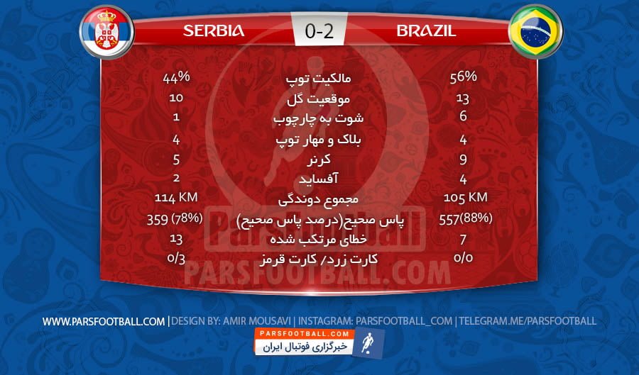 پس از پایان بازی تیم های برزیل و صربستان در بازی های گروه E جام جهانی 2018 روسیه ۶ تیر ۹۷ که این بازی با برتری ۲-۰ برزیل به پایان رسید، در یک اینفوگرافی به آمار پایان این دیدار پرداخته ایم: