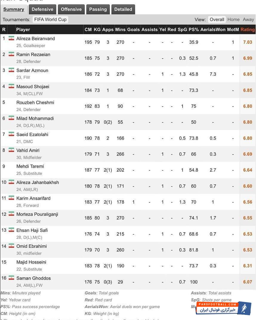 بهترینهای تیم ملی ایران از نگاه نمرات سایت آماری هواسکورد، برای طرفداران خیلی غافلگیرکننده بود. انتخاب اول هواسکورد، دروازهبان تیم ملی بود. بیرانوند که قبل از جامجهانی مورد طنازی فوتبالیها قرار گرفته بود، در این تورنمنت گل کاشت و با مهار پنالتی رونالدو، بهترین بازیکن ایران در جامجهانی روسیه شد. بعد از او نوبت به رامین رضاییان میرسد که بابت خط خوردن وریا غفوری، فشار شدیدی را متحمل شد. ولی فشارها تاثیر زیادی روی عملکرد رامین نگذاشت و او با حضور در همه دقایق جام، دومین نمره را گرفت. شاگرد زرنگِ بعدیِ کیروش، شجاعی و آزمون بودند. مسعود با حفظ توپ و دریبلهایش خیلی محبوب سکوها نبود و آزمون هم در این جام حسابی همه را شاکی کرد. ولی آمار هواسکورد نشان میدهد که چرا کیروش به این دو بازیکن باور داشت. نمره بعدی تیم را هم روزبه چشمی کسب کرد که مدتها مورد هدف قرار داشت.
