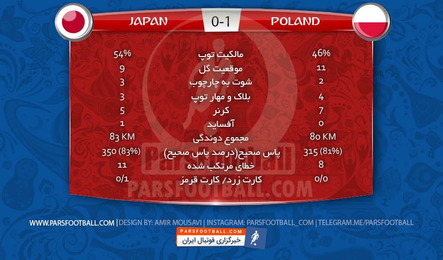پس از پایان بازی تیم های ژاپن و لهستان در بازی های گروه H جام جهانی 2018 روسیه ۷ تیر ۹۷ که این بازی با برتری ۱-۰ لهستان به پایان رسید، در یک اینفوگرافی به آمار پایان این دیدار پرداخته ایم: