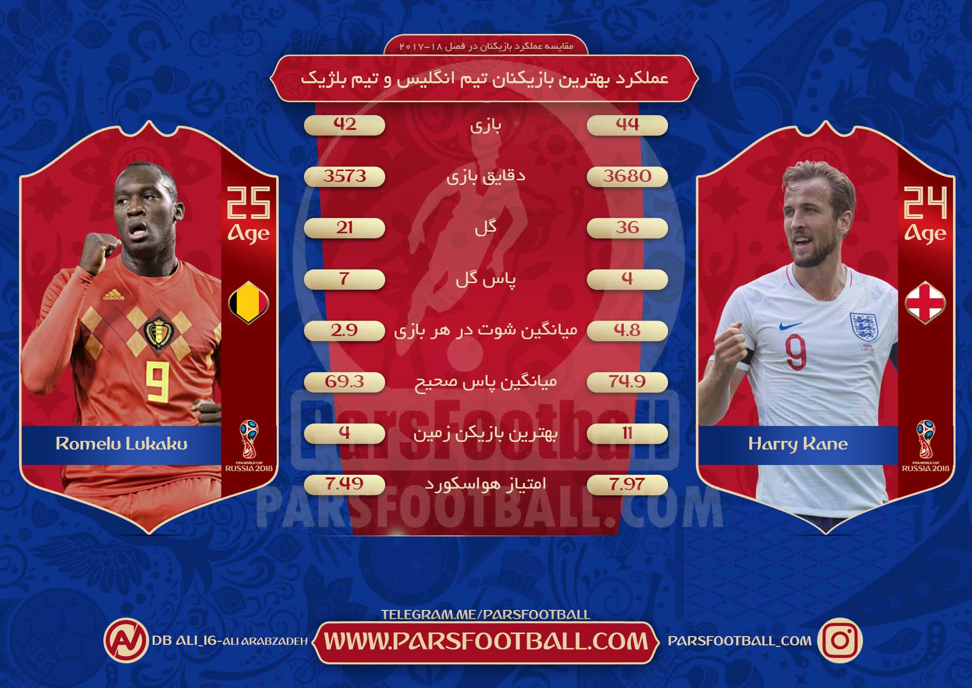 به مناسبت دیدار تیم های انگلیس و بلژیک در بازی های جام جهانی 2018 در یک اینفوگرافی عملکرد هری کین و لوکاکو ستاره های دو تیم را مورد بررسی قرار داده ایم: