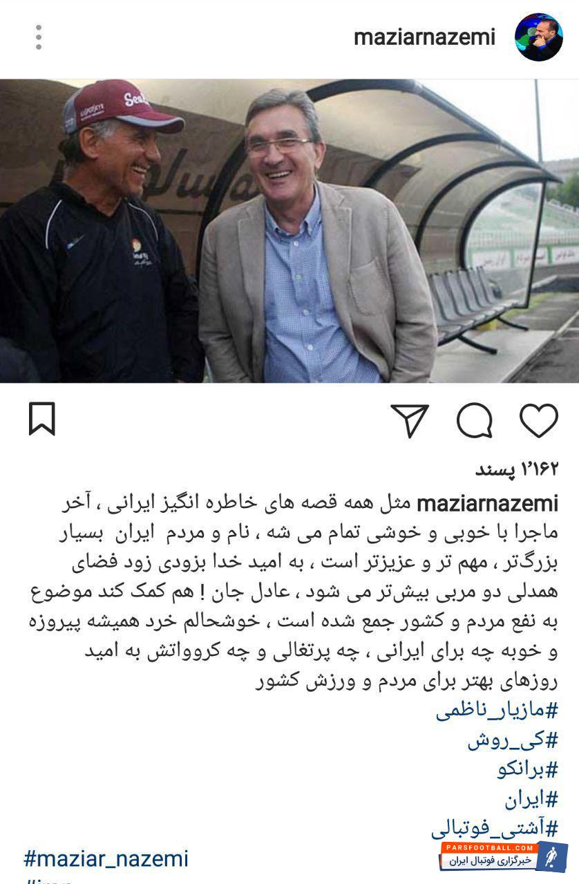 واکنش اینستاگرامی مازیار ناظمی به درگیری های اخیر میان برانکو و کی روش
