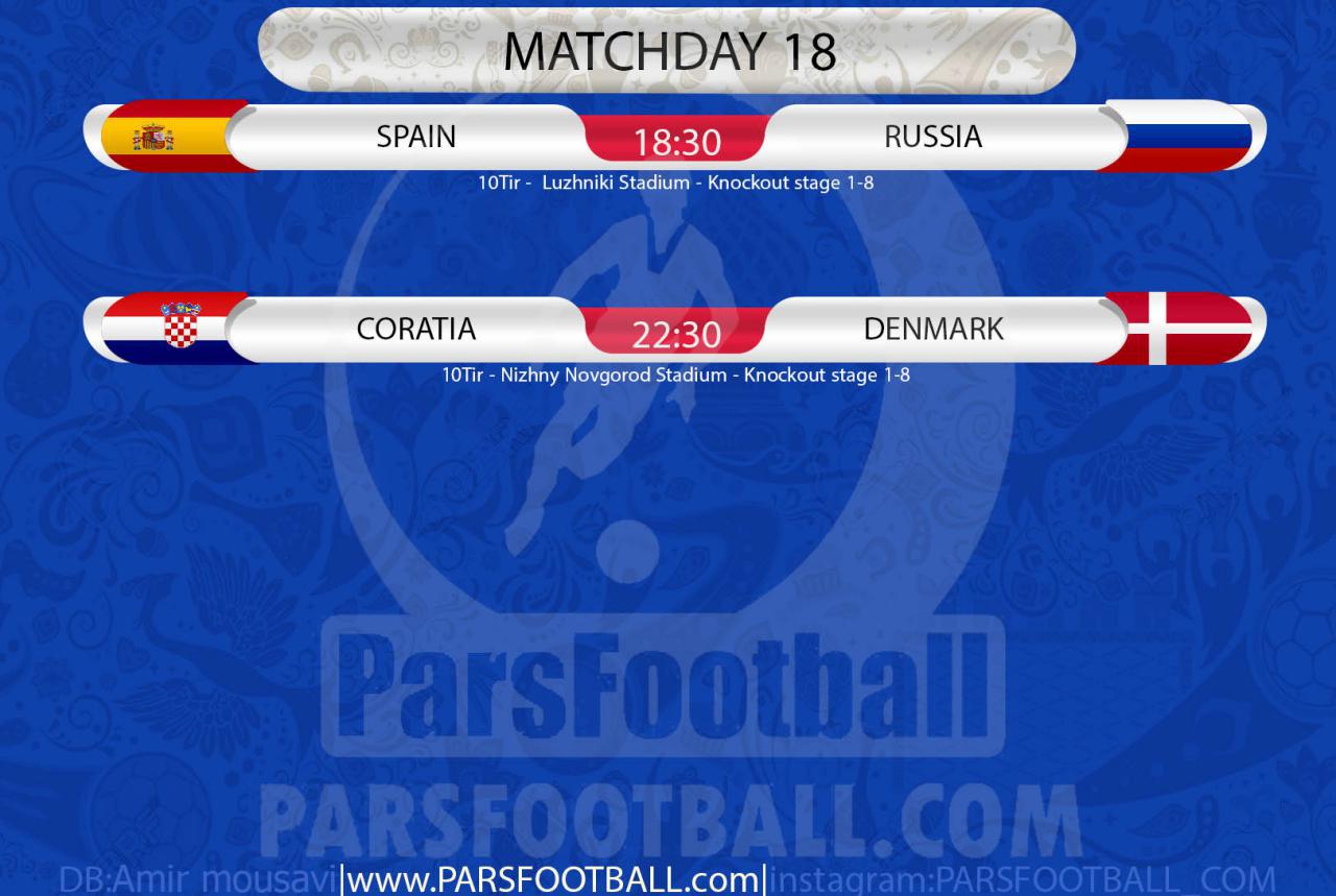 در روز هجدهم جام جهانی و در مرحله یک هشتم نهایی این رقابتها دو مسابقه برگزار میشود که به شرح زیر است: