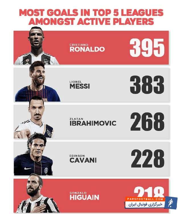 گلزن اسبق رئال با ۳۹۵ گل اول، مسی با ۳۸۳ گل دوم و ابراهیموویچ با ۲۶۸ گل سوم است.کاوانی و هیگواین هم در رتبههای چهارم و پنجم حضور دارند.