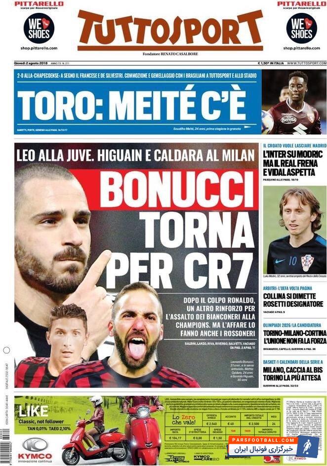 روزنامه توتو اسپورت ، پنجشنبه ۲ آگوست ؛ بونوچی برای CR7 برمی گردد !