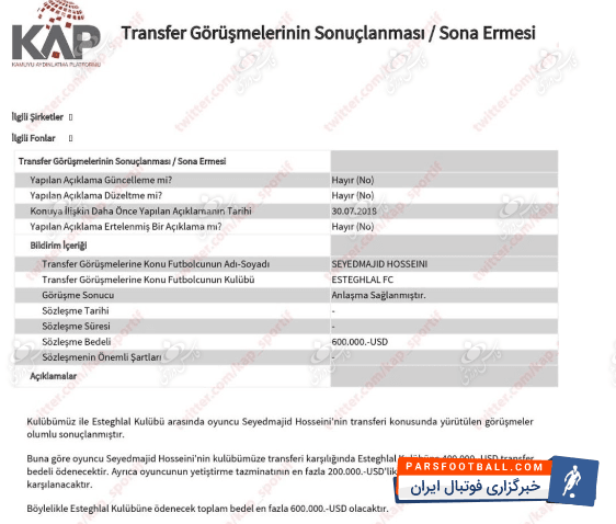 به نقل از سایت CNN ترکیه، بیانیه باشگاه ترکیه ای به این شکل است: مذاکرات برای انتقال مجید حسینی با باشگاه استقلال مثبت بود. با توجه به اینکه حسینی تحت قرارداد باشگاه ایرانی بود بابت فسخ قراردادش ۴۰۰ هزار دلار پرداخت شد. علاوه بر این مبلغ به خاطر حق رشد حسینی نیز باشگاه ۲۰۰ هزار دلار به طرف ایرانی پرداخت خواهد کرد.