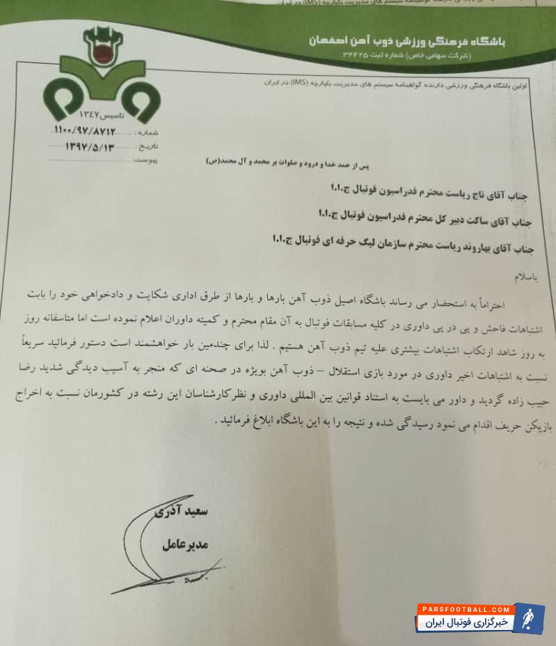 عکس؛ اعتراض رسمی باشگاه ذوب آهن نسبت به اتفاقات دیدار بار استقلال