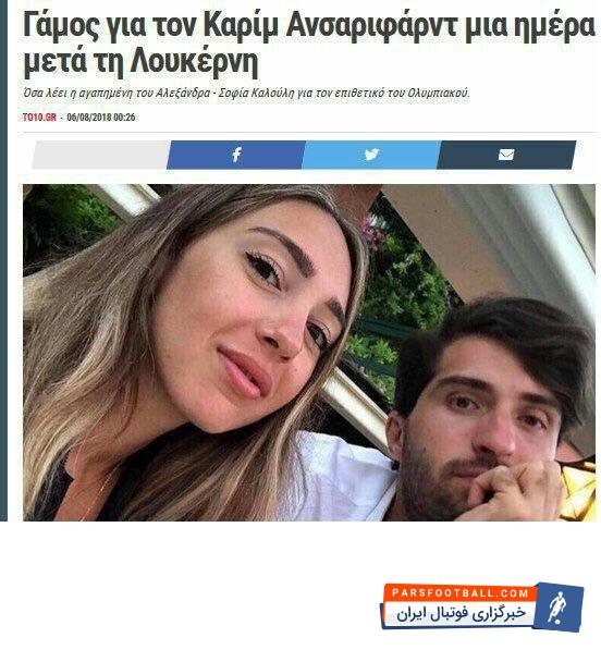 مراسم جشن ازدواج کریم انصاری فرد مهاجم ایرانی تیم المپیاکوس با نامزدش الکساندرا صوفیا که رئیس یک شرکت حمل‌ونقل است روز جمعه در تالار وولا برگزار خواهد شد. این خبر را الکساندرا در صفحه شخصی اش منتشر کرده است.