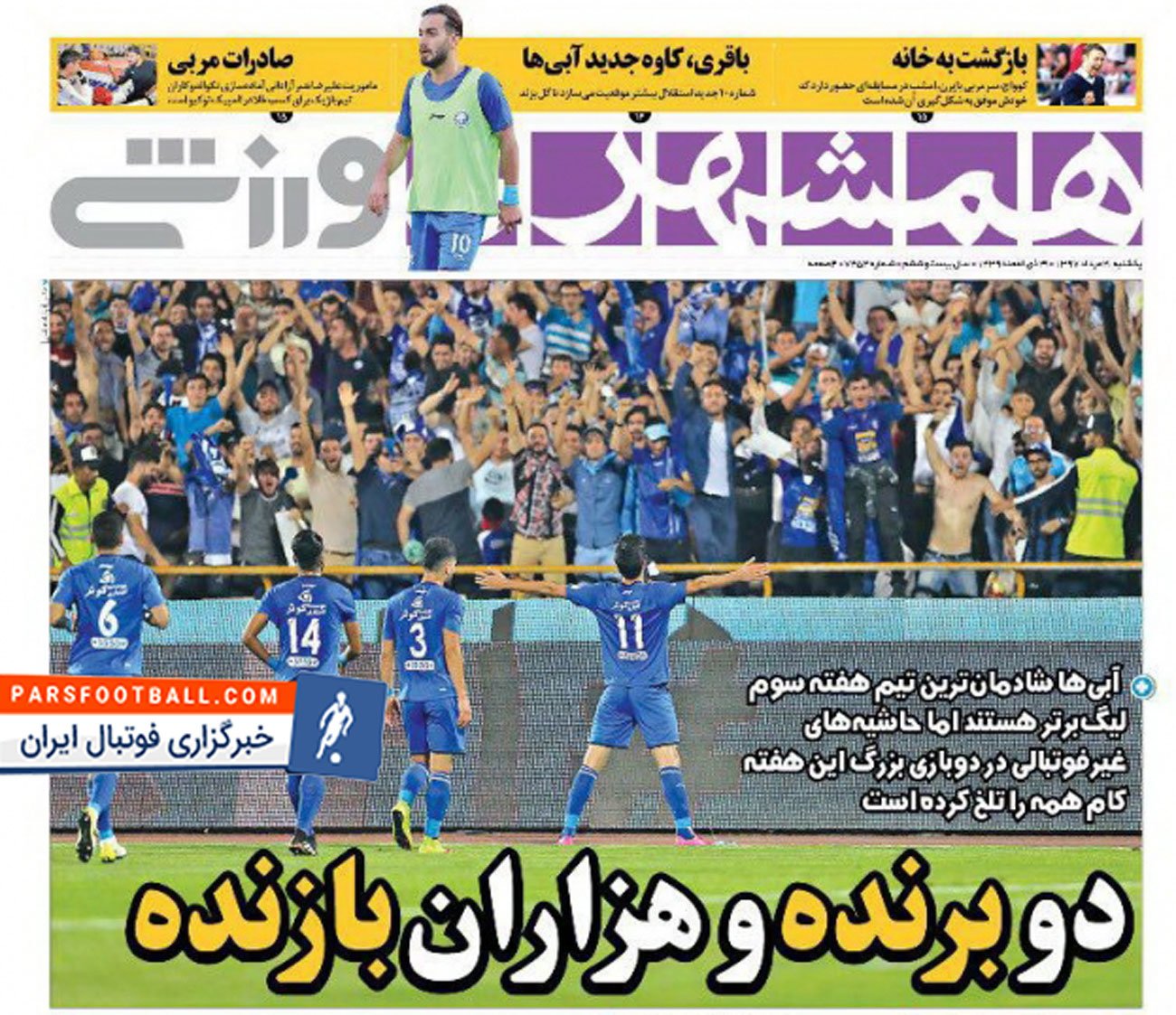 روزنامه همشهری ورزشی ، یکشنبه ۲۱ مرداد ؛ دو برنده و هزاران بازنده برای استقلال !