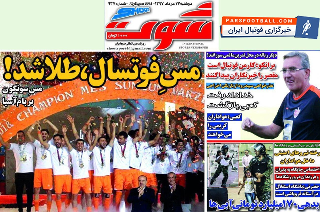 روزنامه شوت ، دوشنبه ۲۲ مرداد ؛ برانکو : کار من فوتبال است ، مقصر را خبرنگاران پیدا کنند !