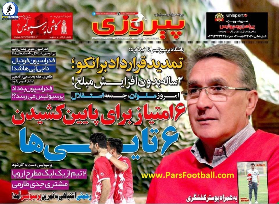 روزنامه پیروزی ۲۱ فروردین | پرسپولیس دست به کار شود تا… ! | فدراسیون ناجی استقلالی‌ها شد | به پرسپولیس هم کمک می‌کنند؟