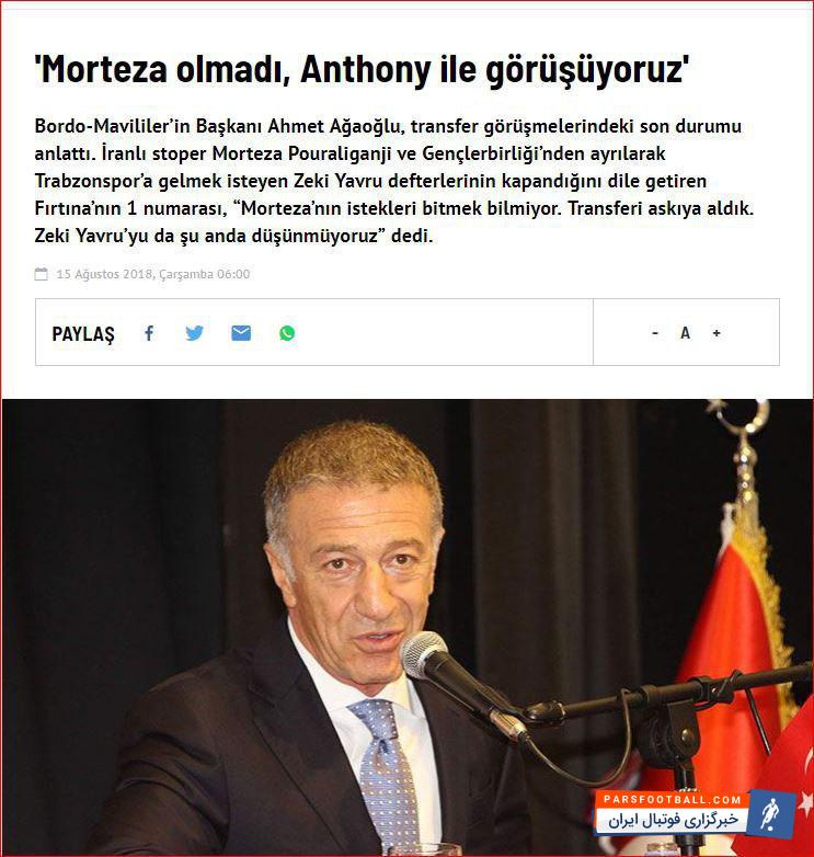 احمد آقااوغلو با اعلام رسمی منتفی شدن انتقال مرتضی پورعلی گنجی به ترابزون، از منتفی شدن تلاش باشگاه برای جذب ذکی یاوور، بازیکن تیم گنچلر بیرلیغی هم خبر داد و گفت: