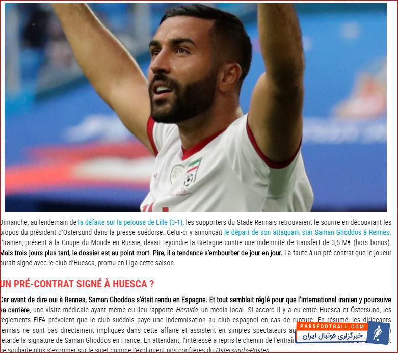 « پرونده مهاجم ایرانی نسبت به روز دوشنبه و اعلام توافق نهایی با رن پیچیده تر شده چون اوئسکا اسپانیا با انتشار اسنادی رسمی سامان قدوس را بازیکن رسمی خود معرفی کرده است. ادعایی که اصلا مورد تایید اوسترشوند نیست از همین رو یکی از جنجالی ترین پرونده های انتقالی در فیفا کلید خورده و مشخص نیست این اتفاق چه تاثیری در روند نقل و انتقالات تابستانی رن خواهد داشت».