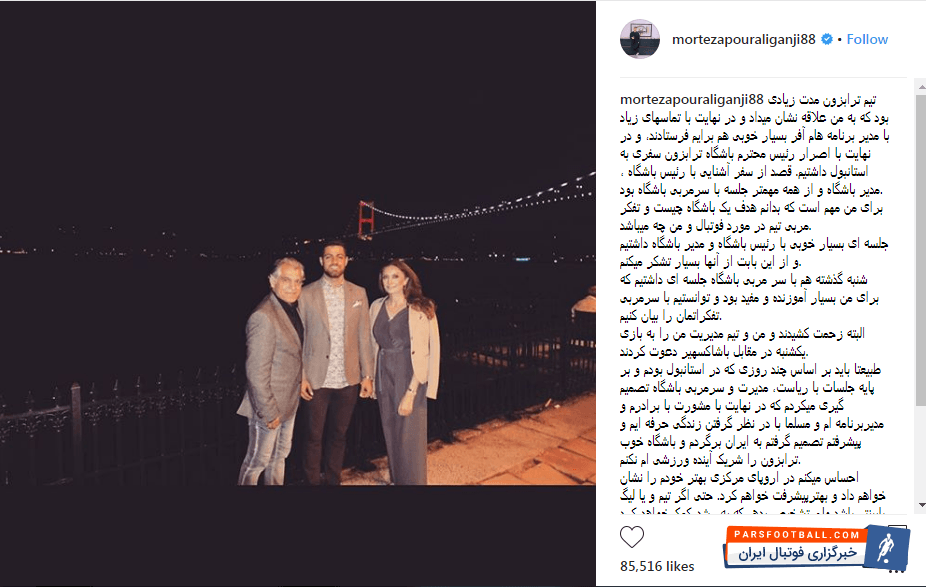 مرتضی پورعلی گنجی مدافع ملی پوش کشورمان دو روز گذشته و پس از به توافق نرسیدن با باشگاه ترابزون اسپور ترکیه پستی را در صفحه اینستاگرام خود منتشر کرد و نوشت: