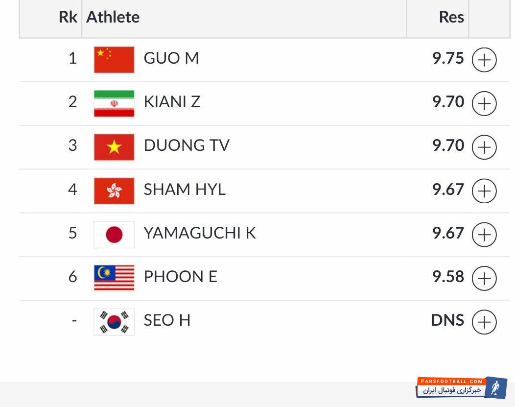 کیانی روز سه شنبه در فرم «چیانگ شو» با حریفان رقابت می کند تا در نهایت مجموع فرم های جین شو و چیانگ شو مشخص کننده جایگاه وی باشد. با درخشش کیانی در فرم جین شو، وی از شانس بالایی برای کسب مدال برخوردار است.