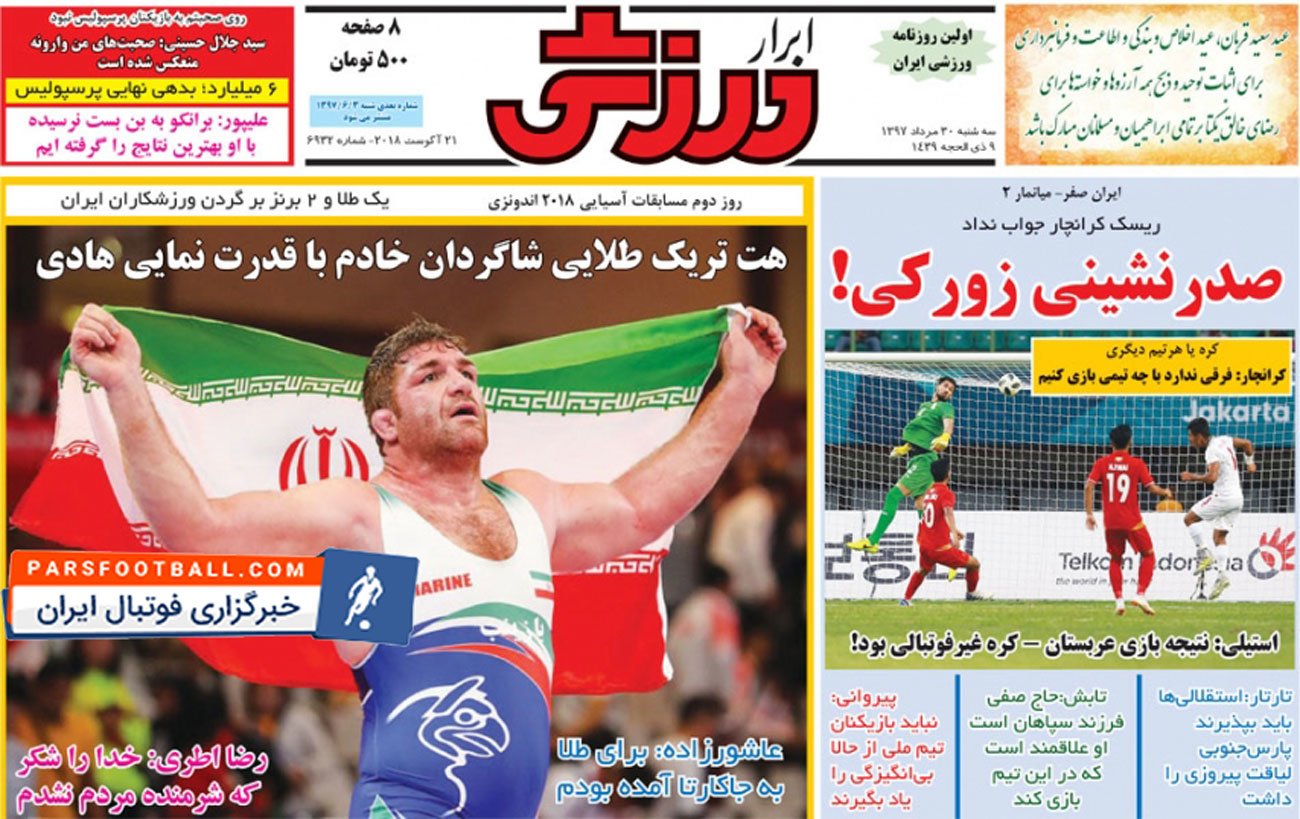 عناوین روزنامه ابرار ورزشی روز سهشنبه ۳۰ مرداد به شرح زیر است :