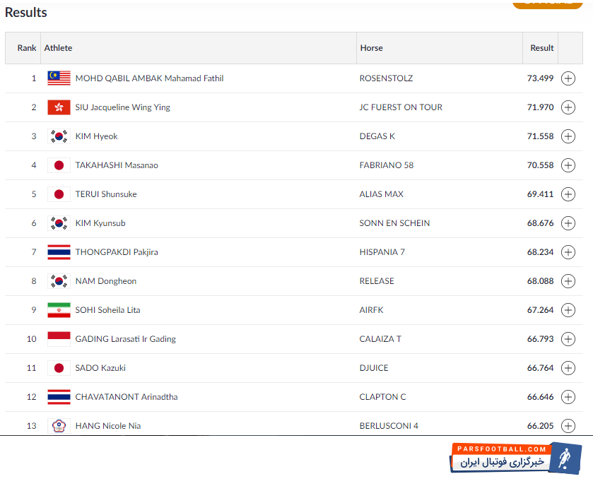 سهیلا سهی سوارکار ایرانی به مصاف رقیبان خود رفت و موفق شد ۶۷.۲۶۴ امتیاز کسب کند و به فینال رقابت های سوارکاری بازی های آسیایی جاکارتا راه پیدا کند.