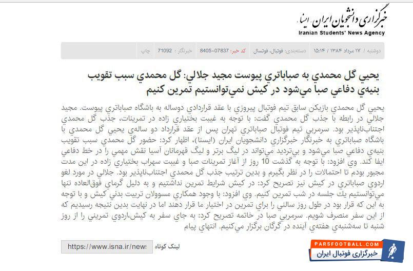 سیزده سال پیش و در مردادماه سال ۱۳۸۴ خبرگزاری های آن زمان از جمله خبرگزاری دانشجویان ایران-ایسنا خبر جالبی منتشر کرد که در آن یحیی گل محمدی به تیم صباباتری می پیوست که هدایتش را مجید جلالی به عهده داشت.