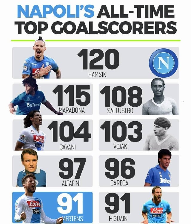 در صدر جدول برترین گلزنان تاریخ ناپولـی همشیک با ۱۲۰ گل و مارادونا با ۱۱۵ گل در مکان دوم دیده میشود.
