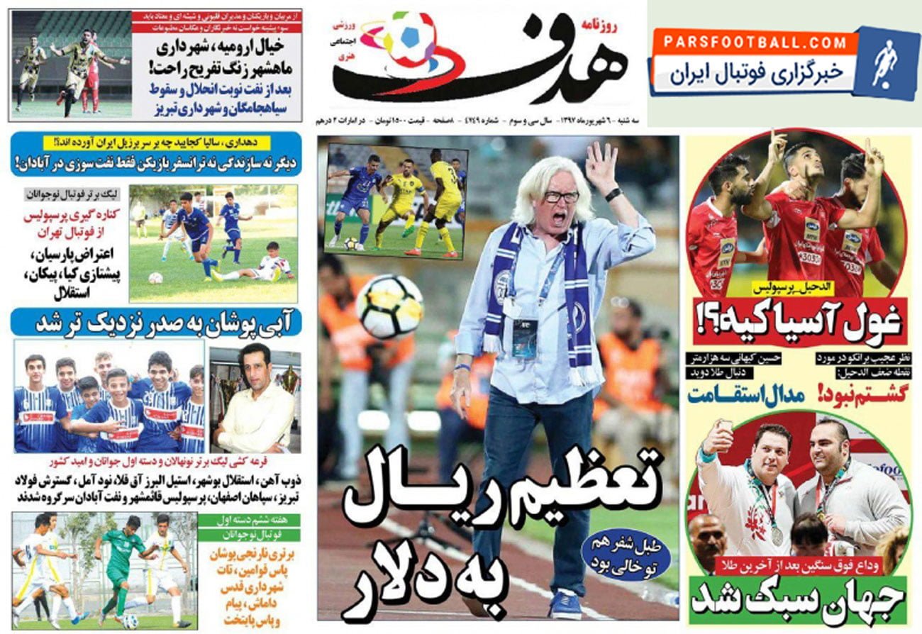 روزنامه هدف ورزشی ، سهشنبه ۶ شهریور ؛ طبل شفر هم تو خالی بود ؛ تعظیم ریال به دلار !
