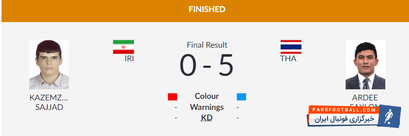 سجاد کاظم زاده بوکسور وزن ۶۹- کیلوگرم کشورمان در دیدار یک چهارم نهایی مقابل حریف تایلندی به میدان رفت و با تیجه ۵-۰ مغلوب این بوکسور شد.