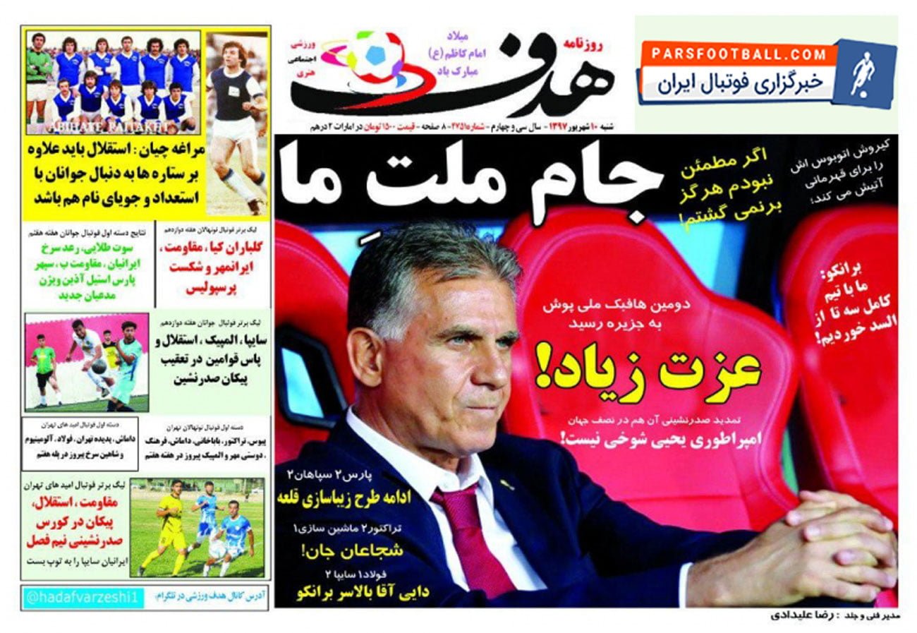 روزنامه هدف ورزشی ، شنبه ۱۰ شهریور ؛ برانکو : ما با تیم کامل ۳ تا از السد خوردیم !