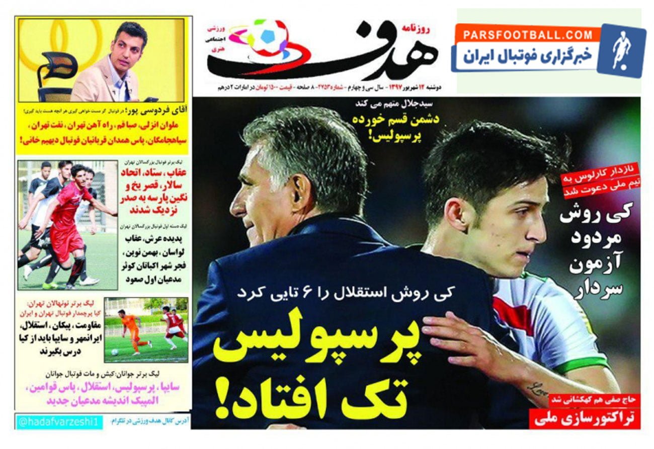 روزنامه هدف ورزشی ، دوشنبه ۱۲ شهریور ؛ سید جلال متهم کرد ؛ دشمن قسم خورده پرسپولیس !