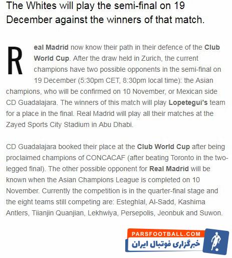 نام سرخابی‌ها در سایت تیم مادریدی منتشر شده است و در صورت قهرمانی استقلال و پرسپولیس در آسیا، احتمال مصاف با رئال در جام باشگاه‌های جهان وجود دارد.