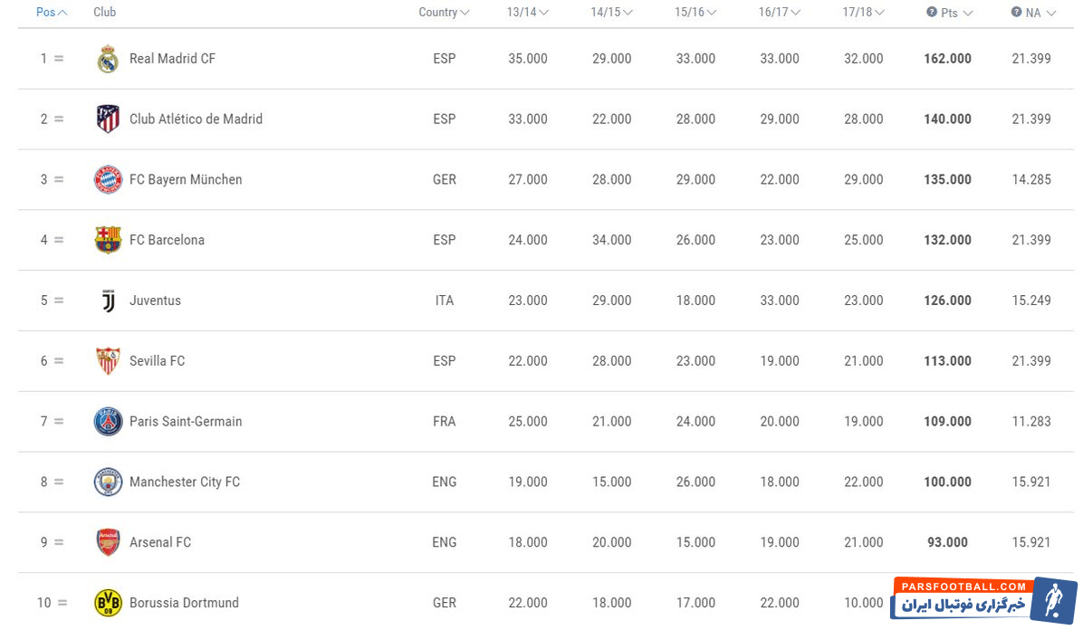 یوفا ردهبندی برترین و بدترین تیمهای باشگاهی اروپا را بر اساس امتیاز مشخص کرد.