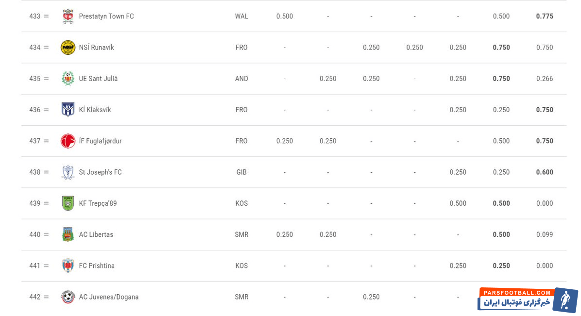 ردهبندی بدترین تیم باشگاهی یوفا به شکل زیر است: