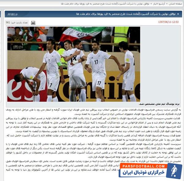 ” قرارداد تیم ملی فوتبال برای البسه نهایی نشده است.از آنجایی که فرآیند مناقصه البسه تیم ملی هنوز به اتمام نرسیده است تا زمانی که فدراسیون به یک توافق نهایی با یکی از برندهای معتبر در این زمینه برسد ، با توجه به اینکه در حال حاضر اقلامی که در این بخش در دسترس فدراسیون فوتبال است و به اندازه کافی در محل ذخیره البسه موجود می باشد ، تصمیم فدراسیون بر این شده است که از تمامی اقلامی که در حال حاضر در اختیار فدراسیون قرار دارد و از سرمایه موجود در زمان و مکان مناسب استفاده شود. بدیهی است تا زمان مشخص شدن اسپانسر تیم ملی در زمینه البسه و تصمیم گیری نهایی در این خصوص و به دلیل دفاع و حفاظت از منابع فنی و مالی تیم ملی فوتبال کشورمان از محل ذخیره البسه موجود استفاده خواهد شد.”