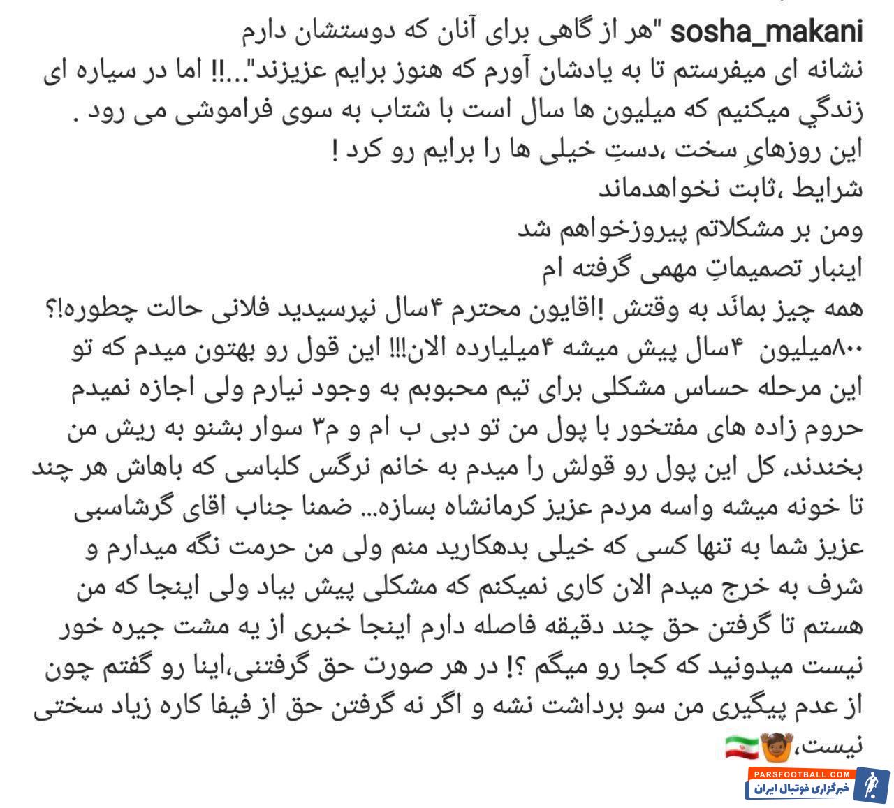 مطلب جدید سوشا مکانی در خصوص شکایت از پرسپولیس