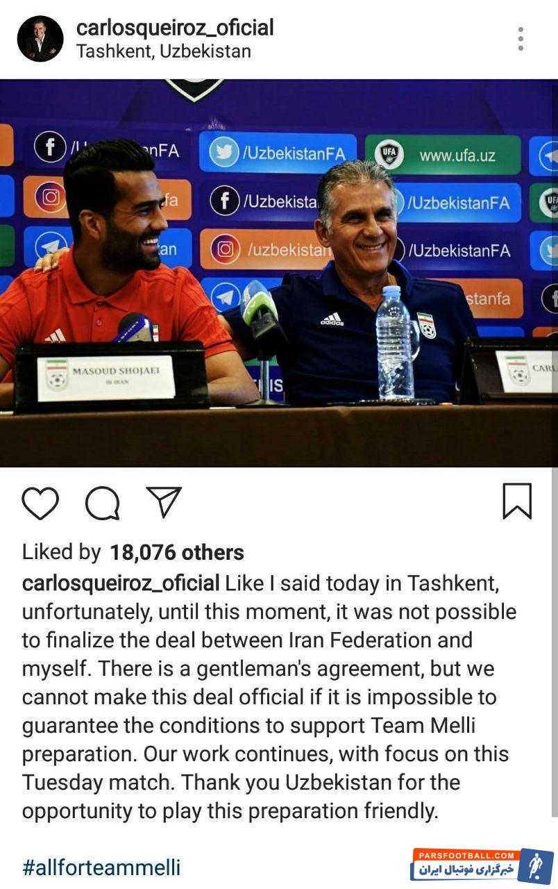 ” همانطور که امروز در تاشکند گفتم، متاسفانه تا این لحطه، امکان نهایی کردن قرارداد بین من و فدراسیون فوتبال ایران فراهم نشد.