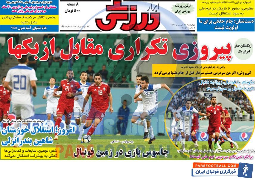نگاهی به روزنامه ابرار ورزشی چهارشنبه ۲۱ شهریور ۹۷؛ باز هم حسرت برد بر دل ازبکها ماند؛ تلاش کی روش برای برگرداندن سردار