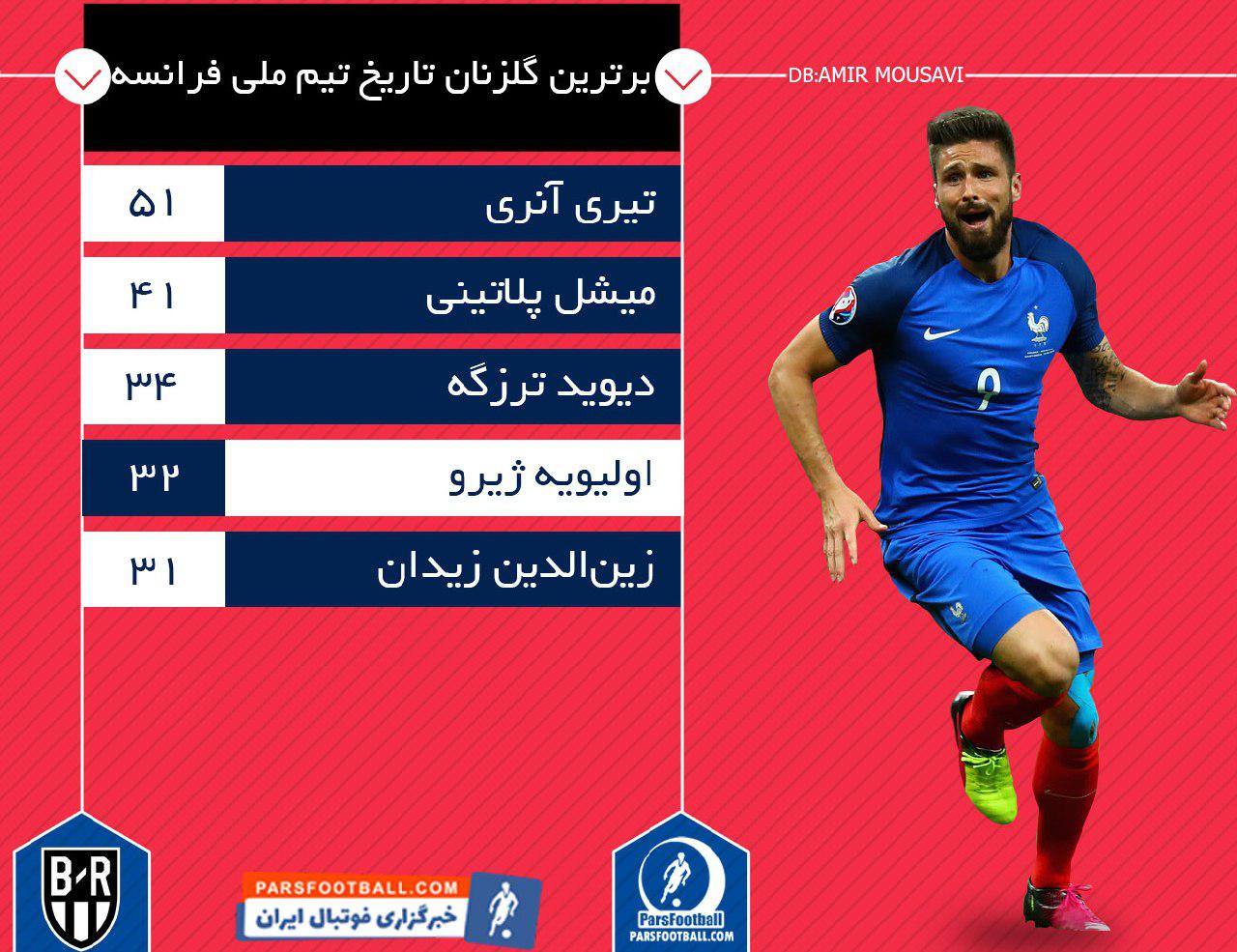 پنج گلزن برتر تیم ملی فرانسه مشخص شد و اولیویه ژیرو در رده چهارم قرار دارد؛ ژیرو تاکنون ۳۲ گل برای تیم ملی فرانسه به ثمر رسانده است.