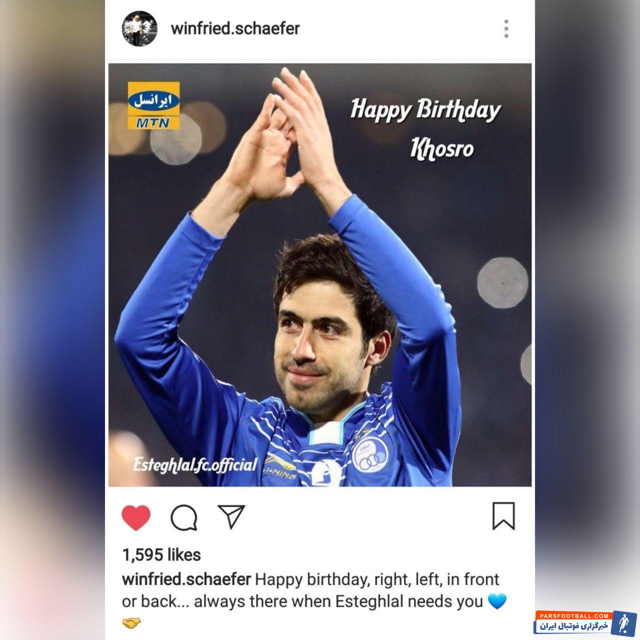امروز تولد خسرو حیدری یکی از کاپیتان های باتجربه استقلال است. به همین مناسبت وینفرد شفر سرمربی آبی ها، با انتشار پستی، تولد بال راست تیمش را به شکل جالبی تبریک گفت.