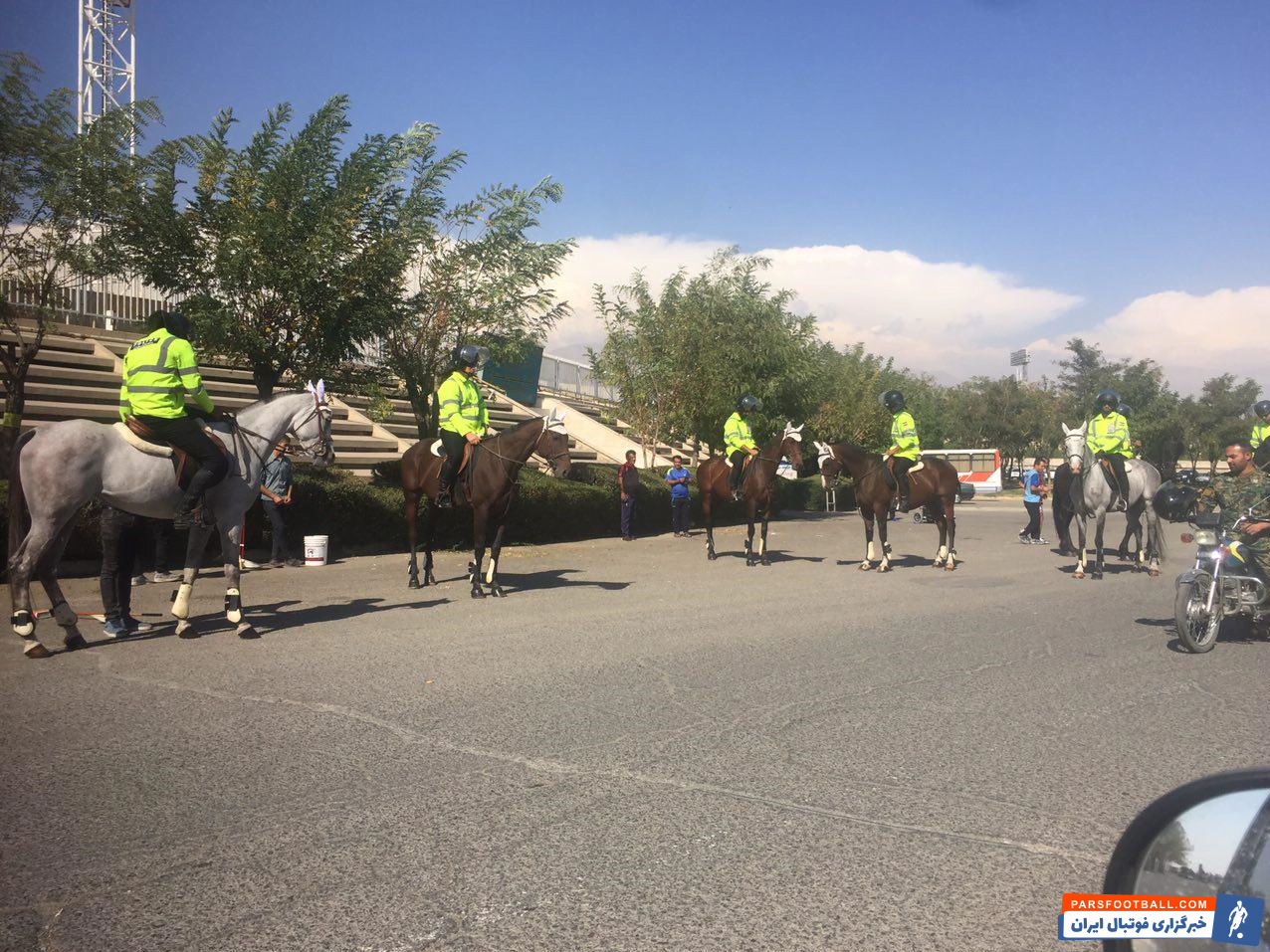 نیروهای امنیتی با اسب در ورزشگاه حضور پیدا کردند.