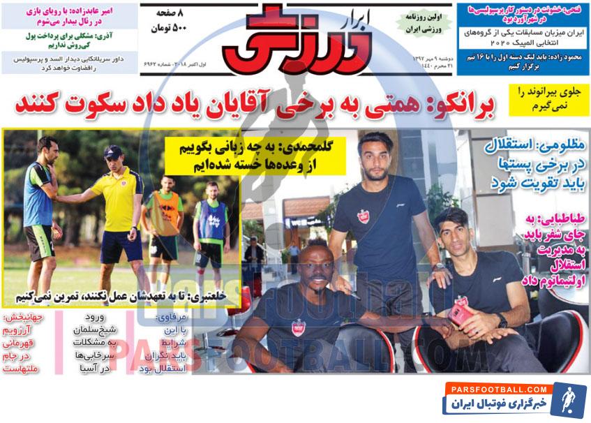 نگاهی به روزنامه ابرار ورزشی دوشنبه ۹ مهر ۹۷؛ برانکو: همتی به برخی آقایان یاد داد سکوت کنند؛ امیر عابدزاده و رویای بازی در رئال مادرید؛ آذری: مشکلی برای پرداخت پول کی روش نداریم؛