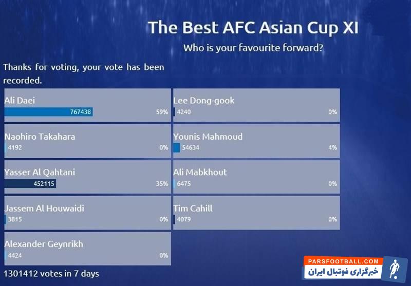 سایت رسمی کنفدراسیون فوتبال آسیا (AFC) اخیراً با انتشار مقالهای اقدام به معرفی ۹ مهاجم برتر تمامی ادوار مسابقات جام ملتهای آسیا کرد و از کاربران سایت خود خواست تا با شرکت در نظرسنجی طراحی شده، اقدام به انتخاب بهترین مهاجم تاریخ جام ملتها کنند. در پایان فرصت هفتروزه شرکت در این نظرسنجی، علی دایی مهاجم پیشین تیم ملی فوتبال کشورمان با کسب ۵۹ درصد کل آرا (۷۶۷ هزار و ۴۳۸ رأی) عنوان بهترین مهاجم تمامی ادوار جام ملتهای آسیا را از خود کرد. یاسر القحطانی، مهاجم پیشین عربستان با کسب ۳۵ درصد آرا نزدیکترین رقیب علی دایی در این نظرسنجی بود.
