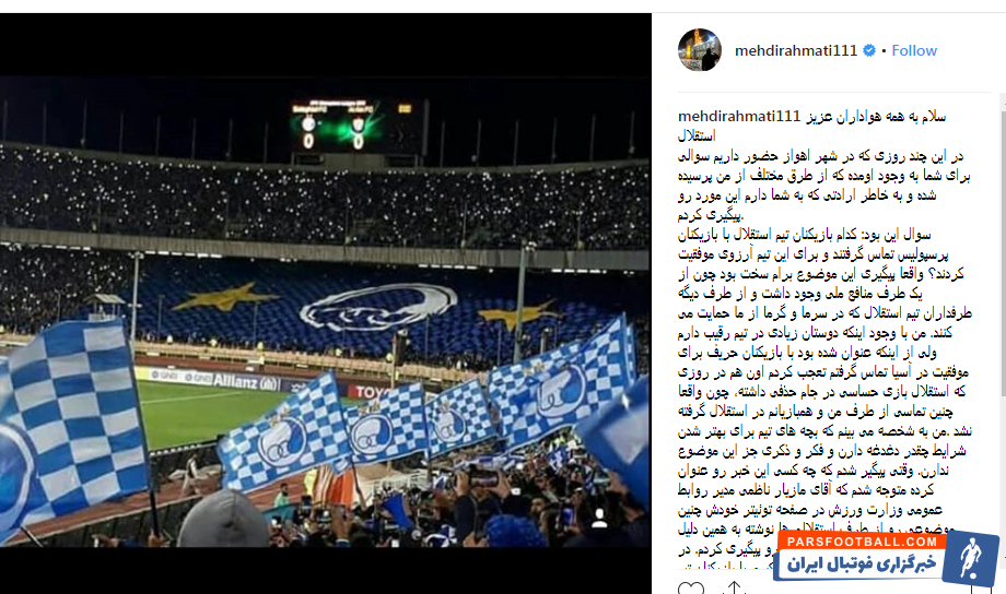 سوال این بود: کدام بازیکنان تیم استقلال با بازیکنان پرسپولیس تماس گرفتند و برای این تیم آرزوی موفقیت کردند؟ واقعا پیگیری این موضوع برام سخت بود چون از یک طرف منافع ملی وجود داشت و از طرف دیگه طرفداران تیم استقلال که در سرما و گرما از ما حمایت می کنند. من با وجود اینکه دوستان زیادی در تیم رقیب دارم ولی از اینکه عنوان شده بود با بازیکنان حریف برای موفقیت در آسیا تماس گرفتم تعجب کردم اون هم در روزی که استقلال بازی حساسی در جام حذفی داشته، چون واقعا چنین تماسی از طرف من و همبازیانم در استقلال گرفته نشد .من به شخصه می بینم که بچه های تیم برای بهتر شدن شرایط چقدر دغدغه دارن و فکر و ذکری جز این موضوع ندارن. وقتی پیگیر شدم که چه کسی این خبر رو عنوان کرده متوجه شدم که آقای مازیار ناظمی مدیر روابط عمومی وزارت ورزش در صفحه توئیتر خودش چنین موضوعی رو از طرف استقلالی ها نوشته به همین دلیل امروز برای احترام به شما موضوع رو پیگیری کردم. در تماس با ایشون سوال کردم که چه کسی با بازیکنان تیم پرسپولیس از تیم ما تماس گرفته که بعد از چند دقیقه مکالمه به جواب قانع کننده ای نرسیدم. در واقع ایشون اسمی نیاوردند و من هر چه به عنوان کاپیتان و نماینده تیم استقلال سعی کردم بدانم کدام بازیکن ما با بچه های تیم حریف تماس گرفته جوابی درست و قانع کننده نشنیدم. به نظرم خبر صحت نداشته و پیگیری من که این رو نشون می داد مگر اینکه خود ایشون به هواداران توضیح بدن.