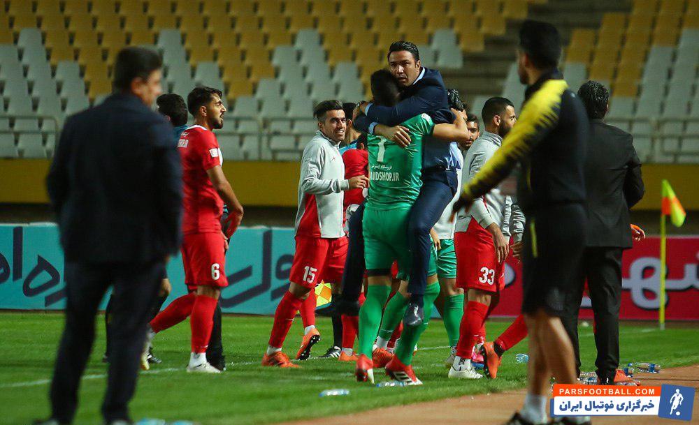 سرمربی نساجی مازندران و محبوب استقلالی ها بعد از به ثمر رسیدن گل دوم تیمش برابر سپاهان درآغوش دروازه‌بان تیمش قرار گرفت.