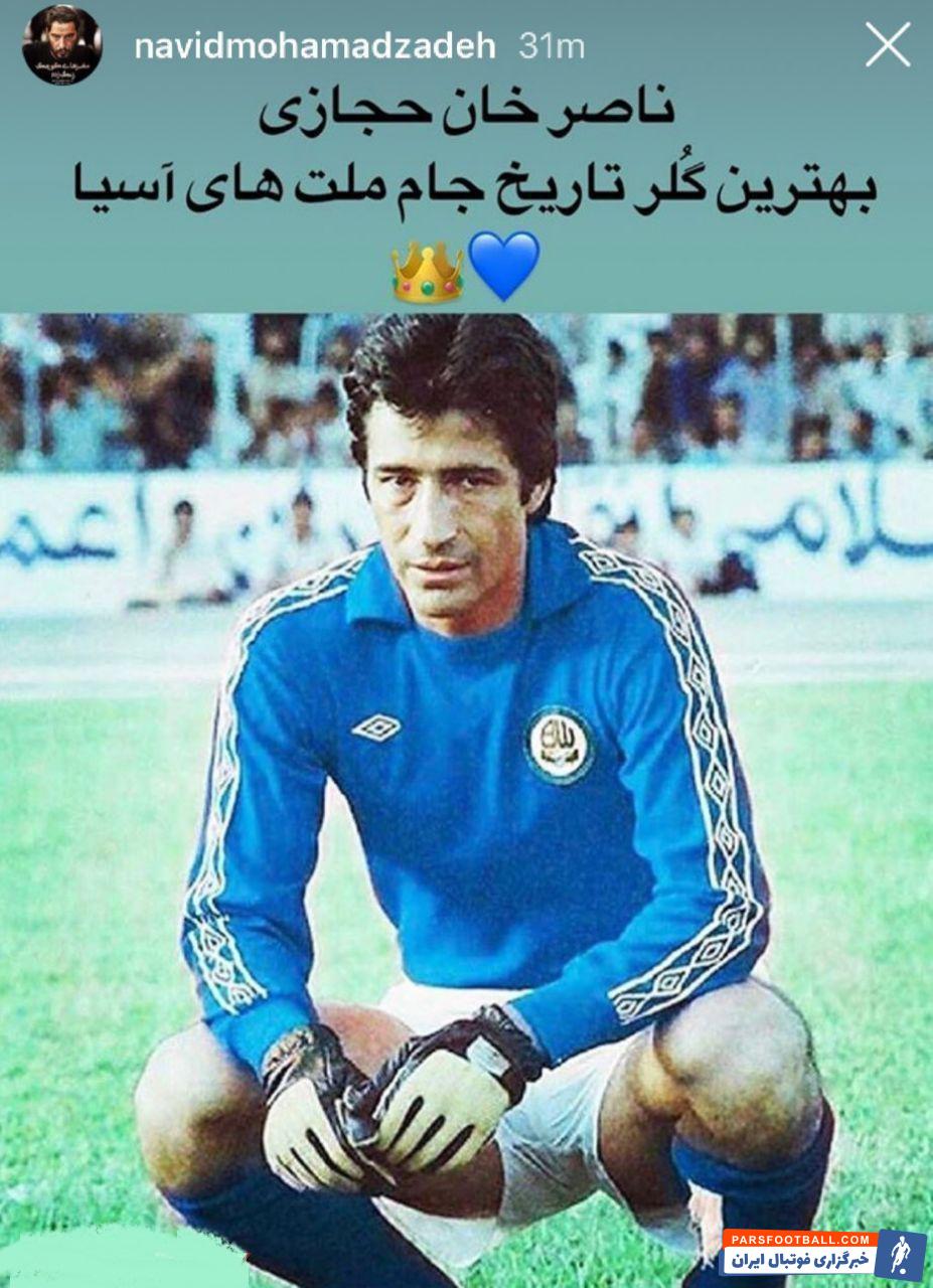 نوید محمدزاده که از قرار به شدت استقلالی است، به بهانه انتخاب مرحوم ناصر حجازی گلر سابق استقلال به عنوان برترین دروازه‌بان تاریخ جام ملت‌های آسیا، یک استوری در صفحه اینستاگرامش منتشر و بابت این انتخاب ابراز خرسندی کرد.