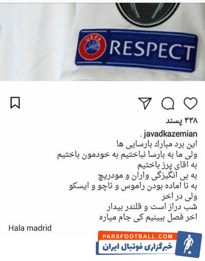 رئال مادرید در ال کلاسیکوی رفت این فصل لالیگا با نتیجه ۵-۱ به بارسلونا بدون لیونل مسی باخت. بعد از این باخت جواد کاظمیان ، مهاجم سابق پرسپولیس که طرفدار پر و پا قرص رئال است، همانطور که در تصویر میبینید برای بارساییها کری خواند.